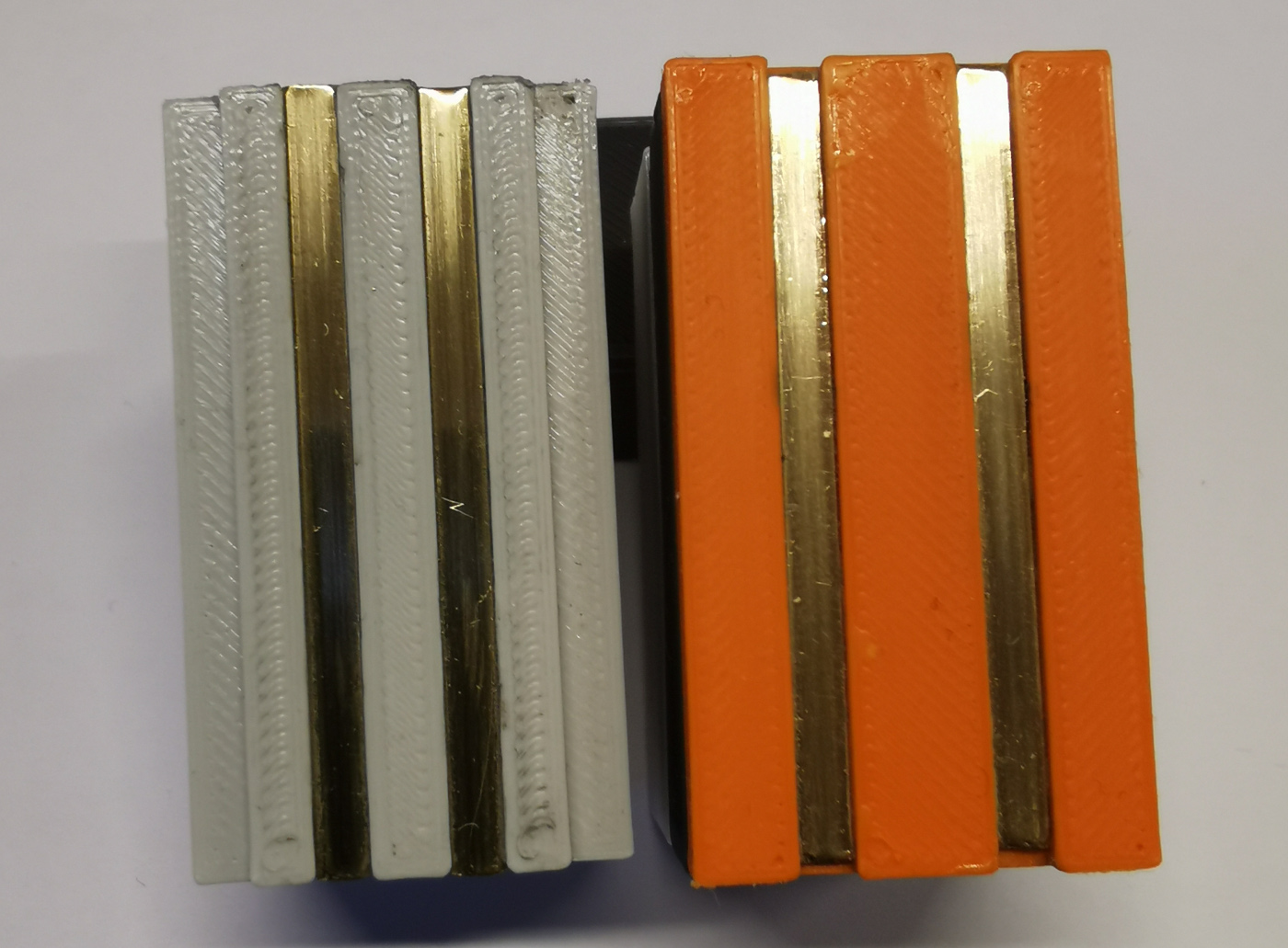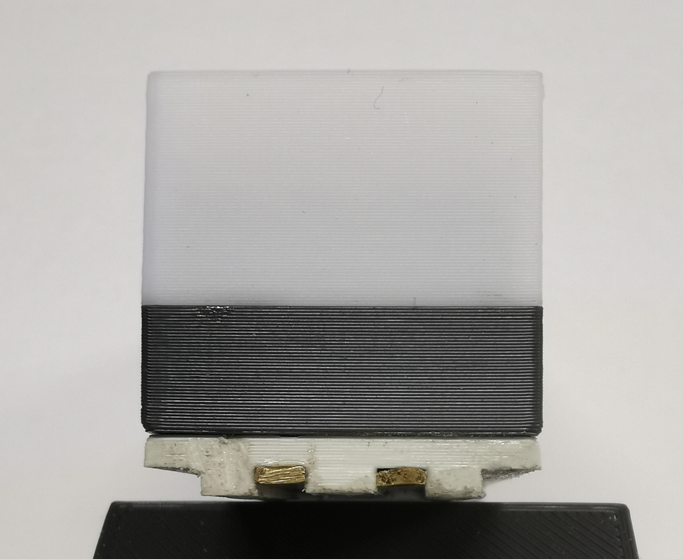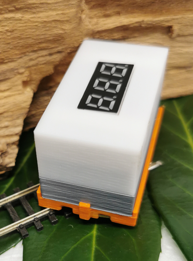 Das Gehäuse ist aus PLA (3D-Druck, Die Farben der Grundplatten sind je nach Baugröße unterschiedlich). Die Stromaufnahme erfolgt über Messing-Profile direkt von den Gleisen.